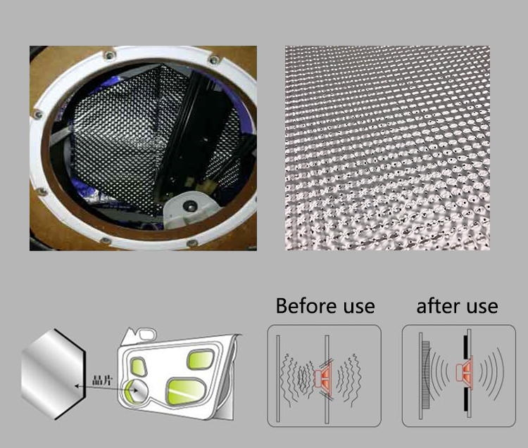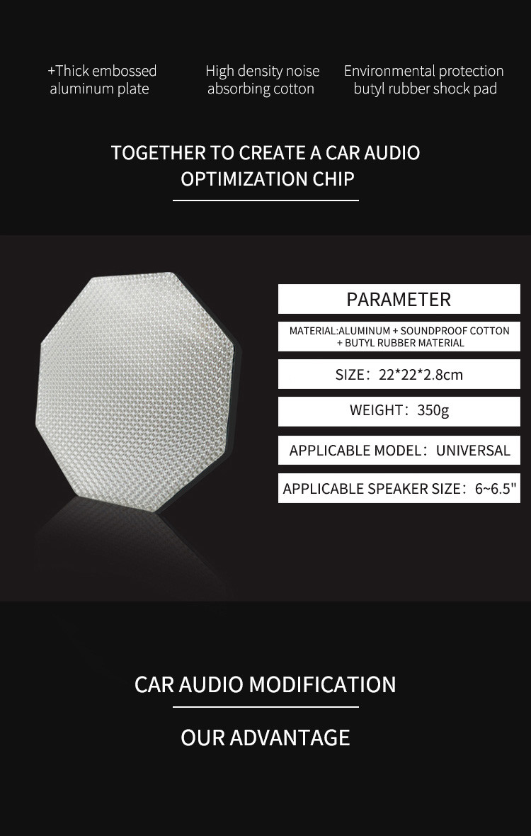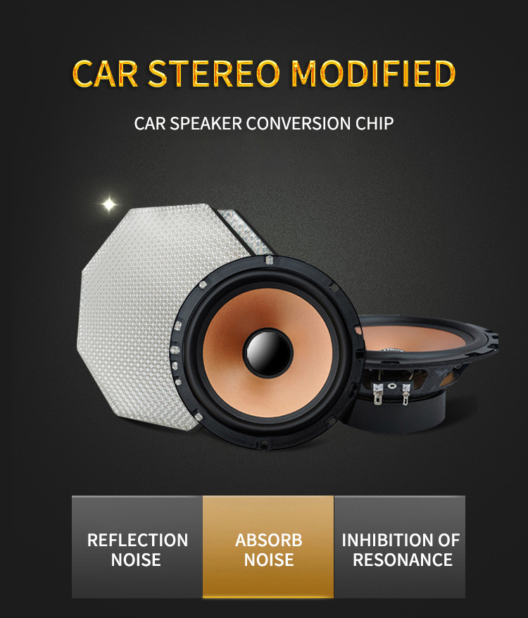 It has a hexagonal shape and is a multi-functional diffuse reflection layer composed of three layers of elastic materials. The main component is a composite of polymer butyl rubber and high-density polyurethane foam. The surface of the chip is covered with a layer of aluminum foil. It can effectively reflect and disperse the sound waves radiated back by the speaker. The most suitable temperature range is -45 degrees to 100 degrees. The chip is an effective means to improve the clarity of the speaker's sound quality during the audio modification process.