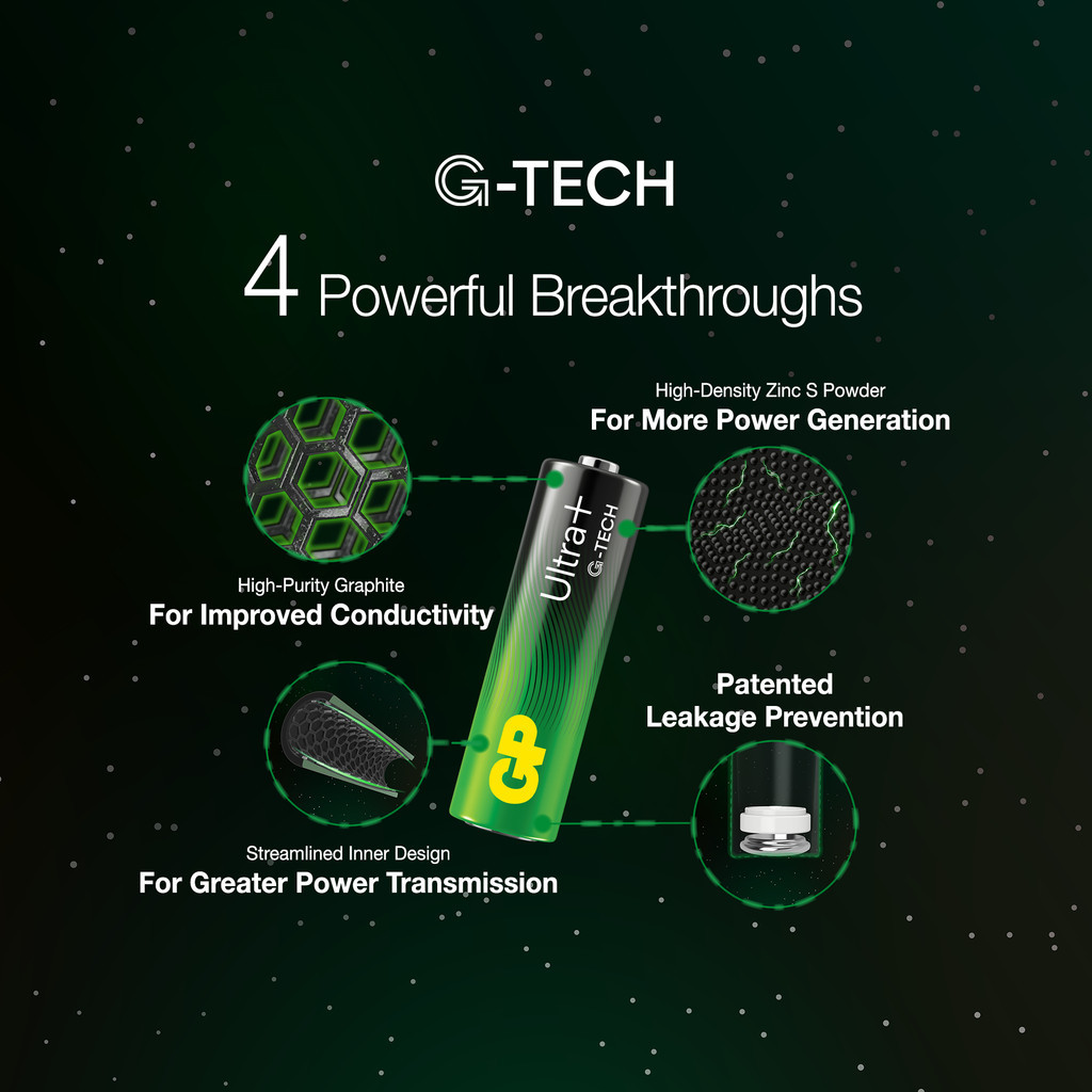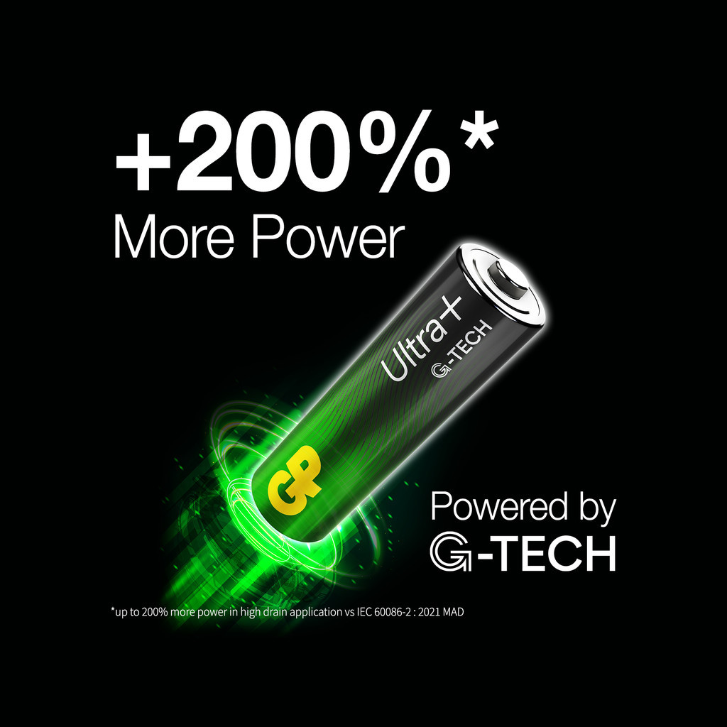 Meet the new and improved Ultra+ Alkaline range. Unleash up to 200% more power*, driven by G-TECH. G-TECH harnesses 4 powerful breakthroughs to deliver more power for longer durations and more memorable moments. Enjoy stronger, more consistent, more powerful energy flow in your high-drain battery-powered devices and smart home devices today!