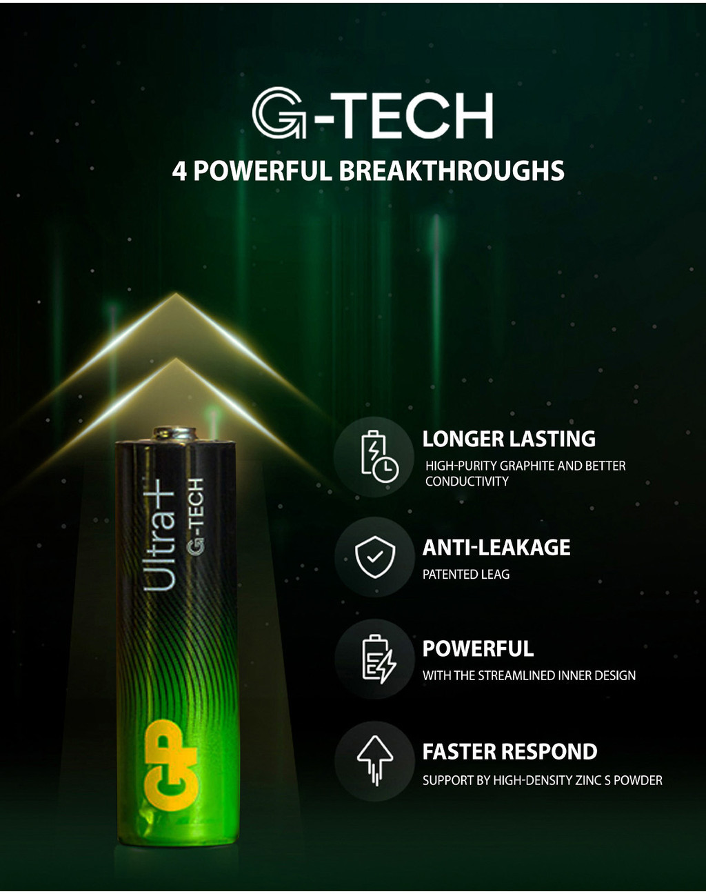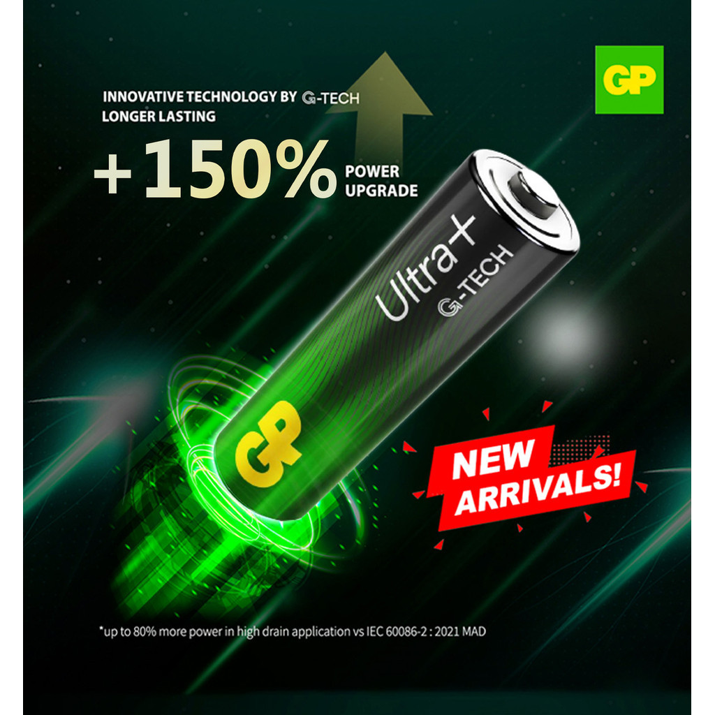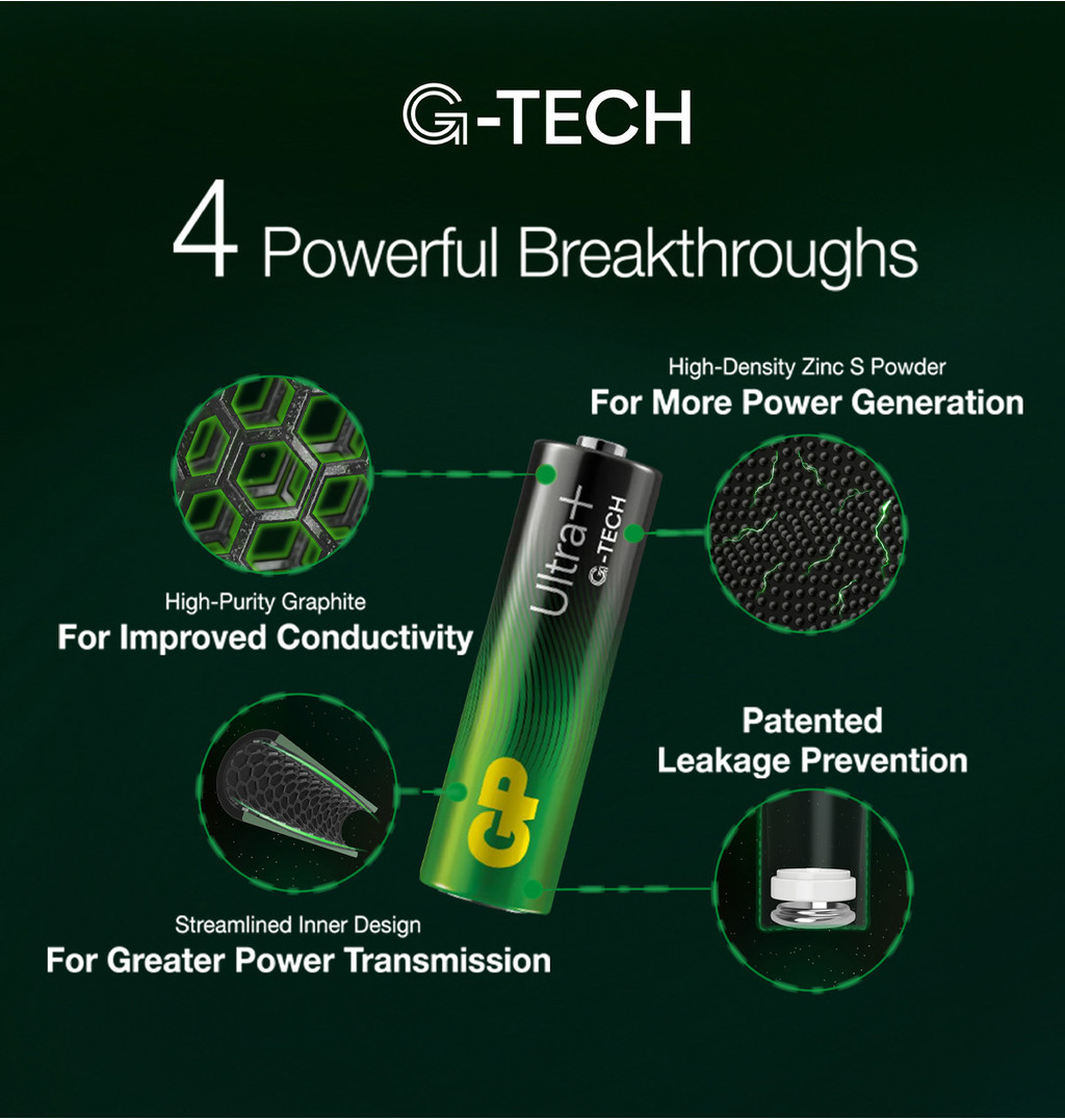 Meet the new and improved Ultra+ Alkaline range. Unleash up to 150% more power*, driven by G-TECH. G-TECH harnesses 4 powerful breakthroughs to deliver more power for longer durations and more memorable moments. Enjoy stronger, more consistent, more powerful energy flow in your high-drain battery-powered devices and smart home devices today!
