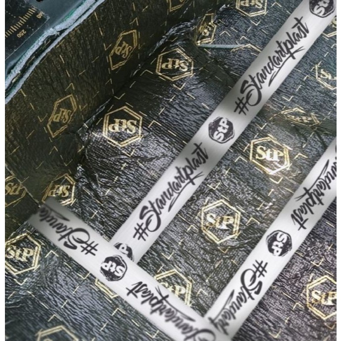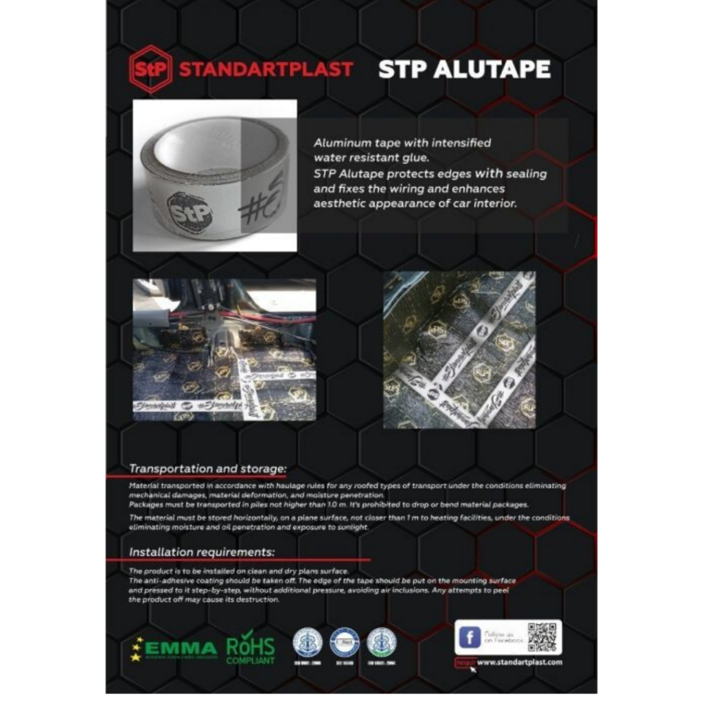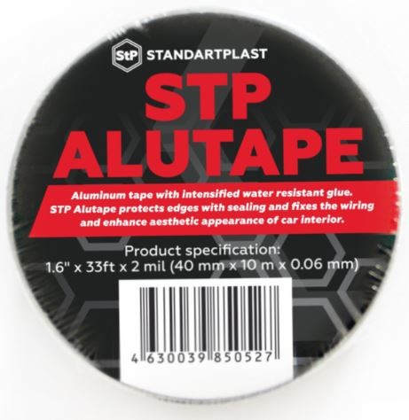 STP Alutape is a type of self-adhesive aluminum tape produced by the brand Standartplast (STP), primarily used for soundproofing and vibration damping in vehicles, as well as for general repair and insulation purposes in other applications. It features a durable aluminum foil construction that enhances its effectiveness in reducing noise and heat.